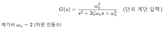 | ζ = 0.2 | 과도 감쇠 (Underdamped): 빠르지만 진동 있음, 오버슈트 존재 |