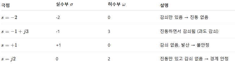 - 극점이 실수축 위에만 있으면 → 진동 없이 안정 또는 불안정